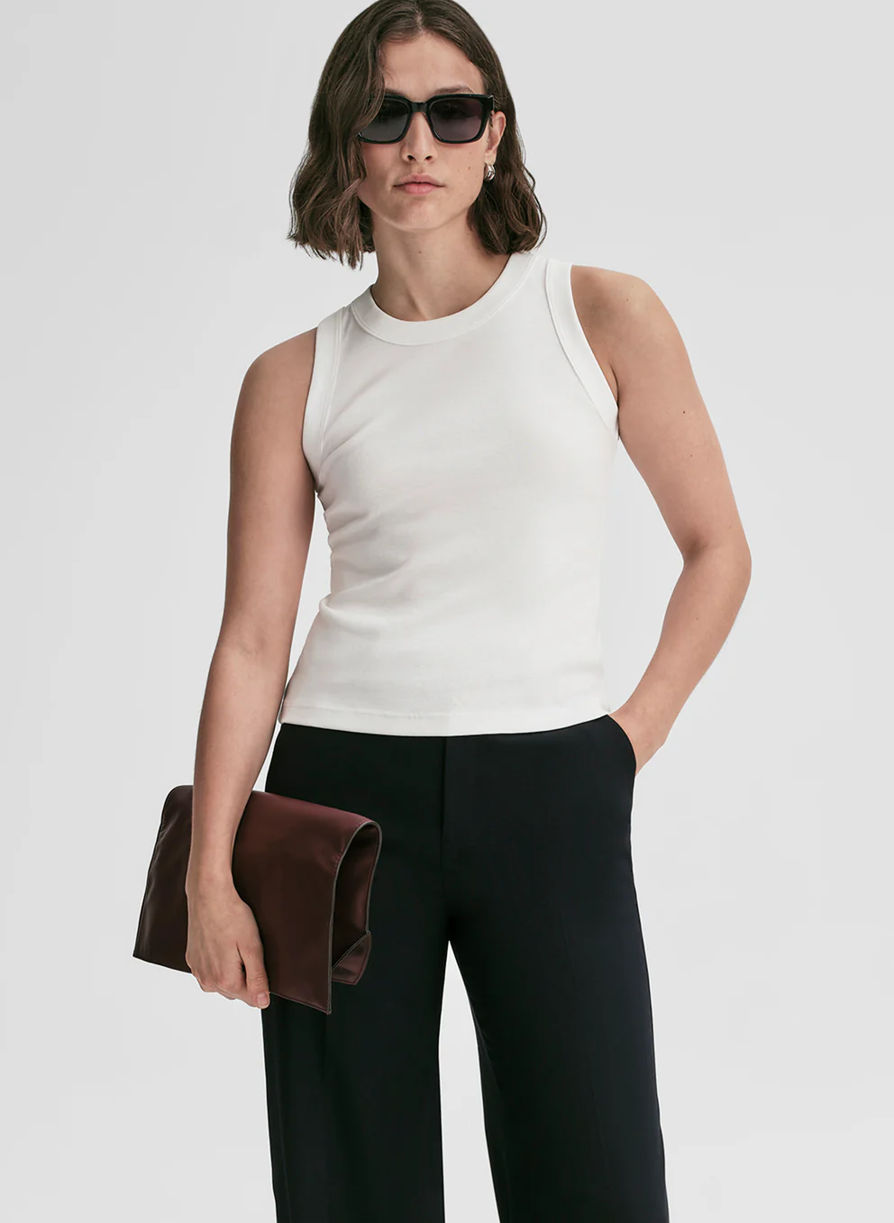 The Hadley Tank is crafted from a soft ribbed cotton fabric in wardrobe-essential white. This hip-skimming silhouette features a crew neckline and wide straps with a clean, minimalist look. Styling Tip: Bring a casual touch to tailoring by pairing with trousers or a structured skirt.
