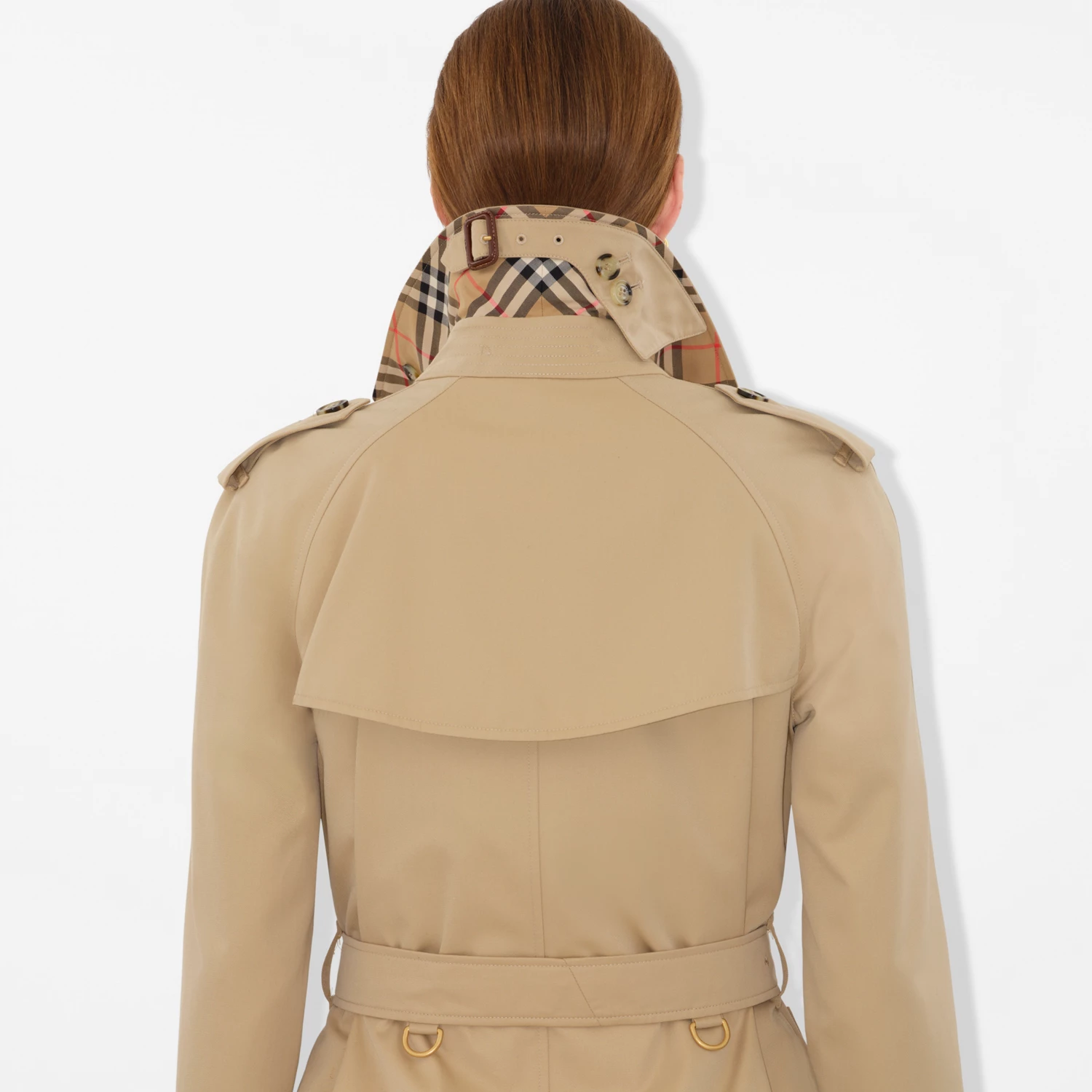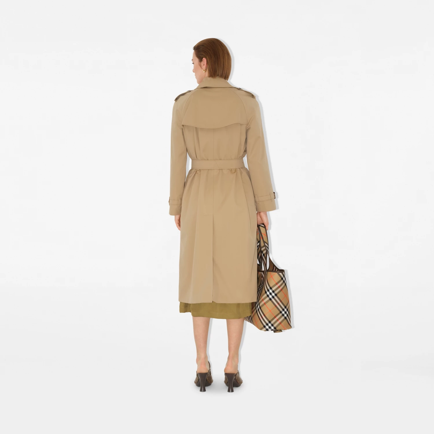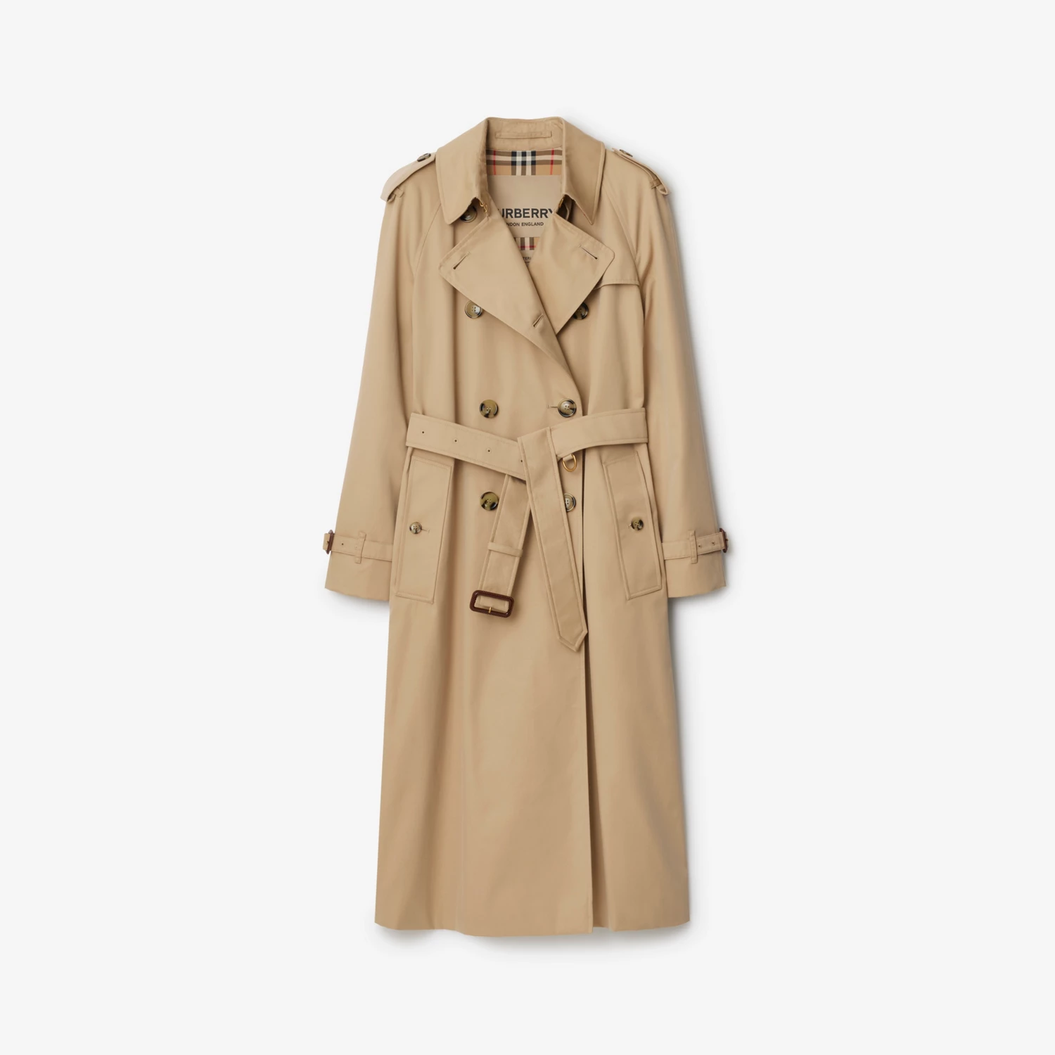 The iconic Burberry trench coat, made in England from shower-resistant cotton gabardine. Inside is Burberry Check cotton, used to line our coats since the 1920s. Part of the Heritage Collection, the Waterloo is cut to a regular fit with raglan sleeves.