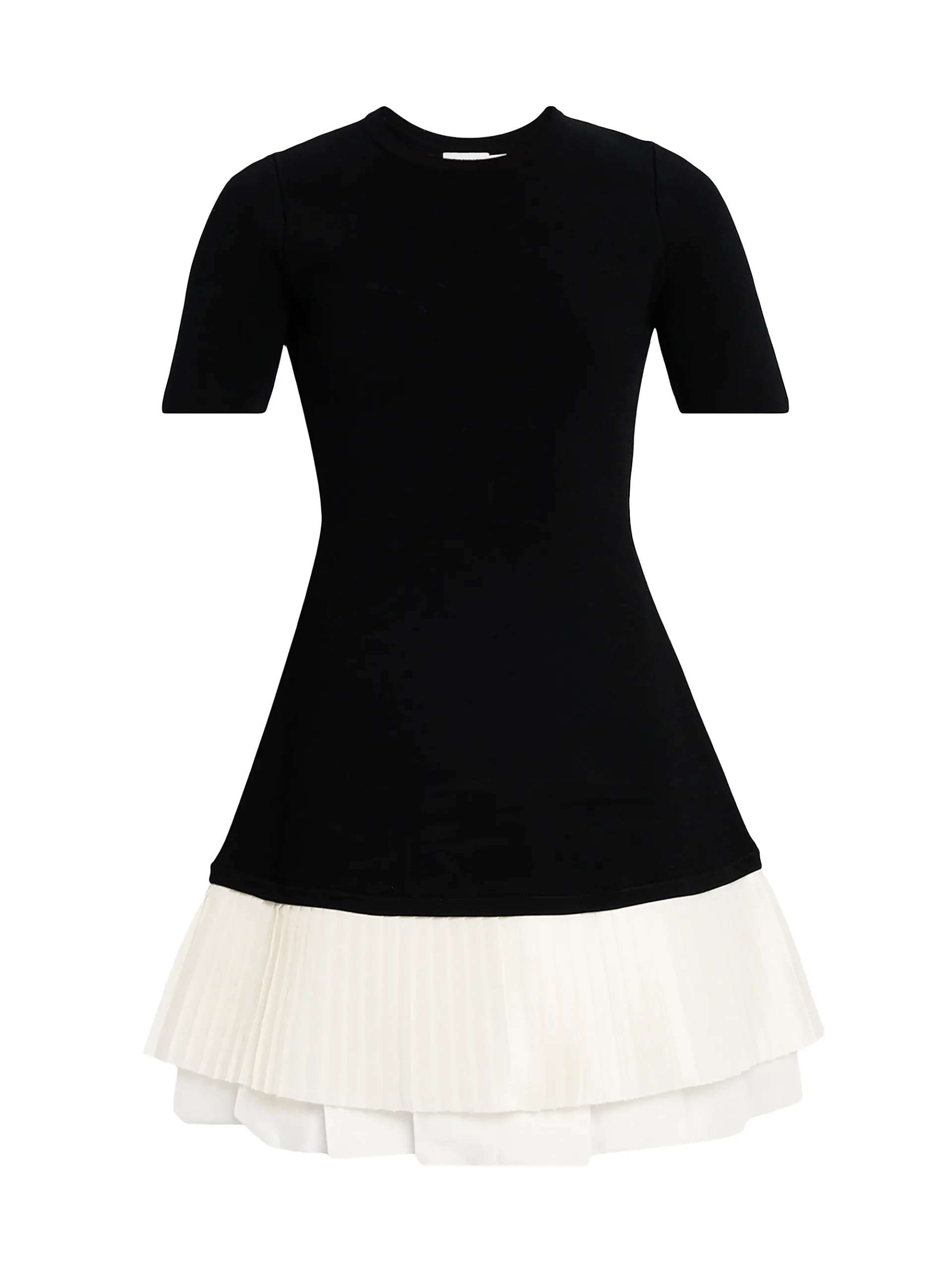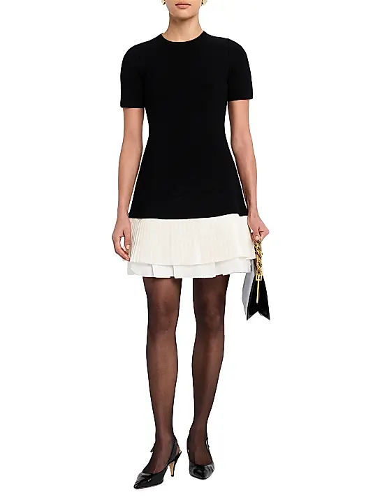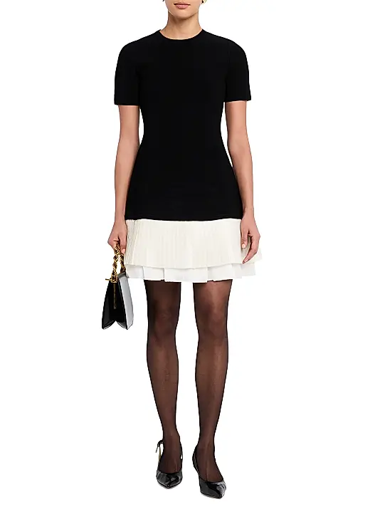 SIMKHAI's Lorin minidress enhances the A-line silhouette with a woven, layered knife-pleated inset at the hem. Crafted of a stretch fabric, this pullover piece features a traditional crewneck and short sleeves.