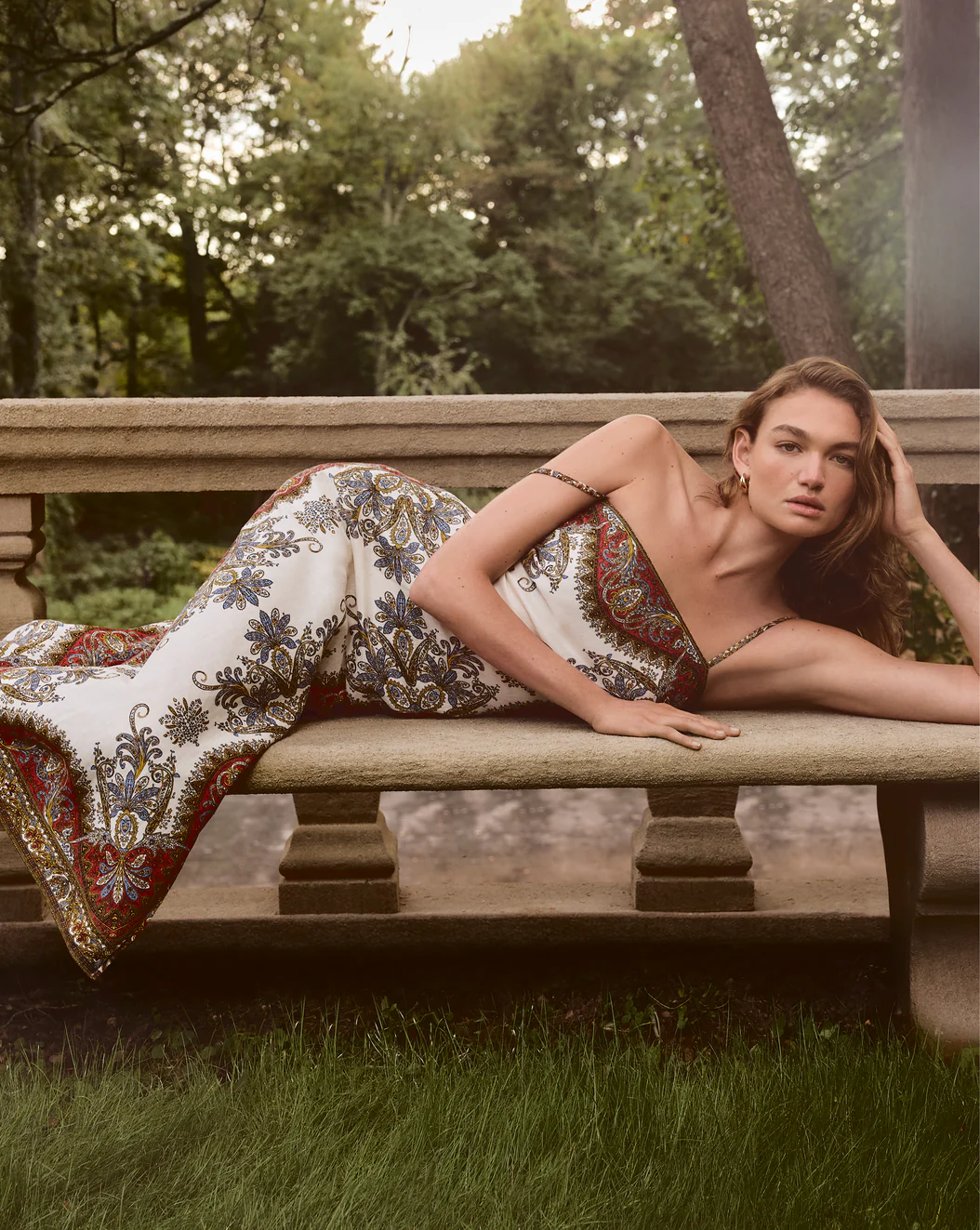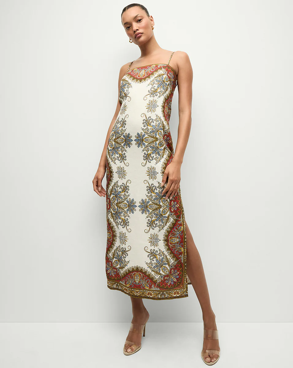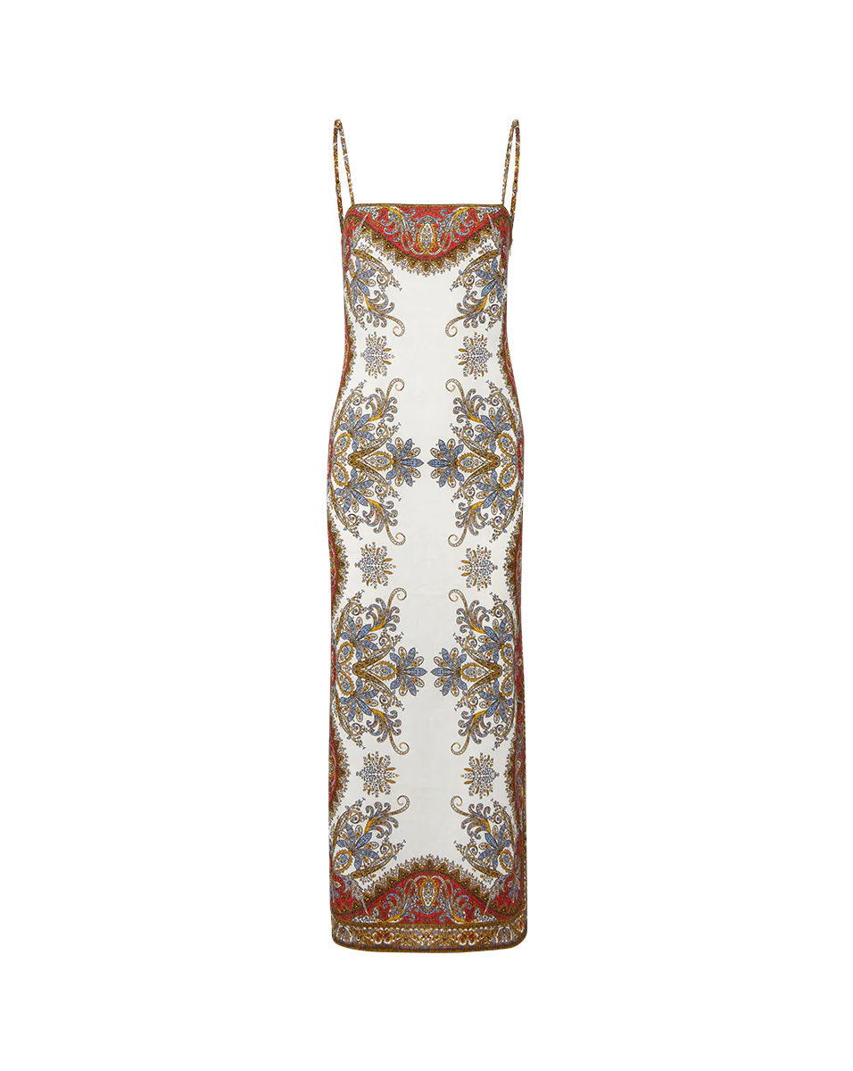 Made from lightweight linen, the Petra maxi dress contrasts a clean, streamlined slip silhouette with a beautiful ornamental floral—a winning combination for both ease and elegance. Finished with adjustable straps, a square neckline and a zip up the back, this is perfect for weekends and wanderlust.