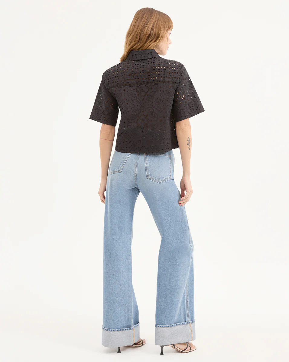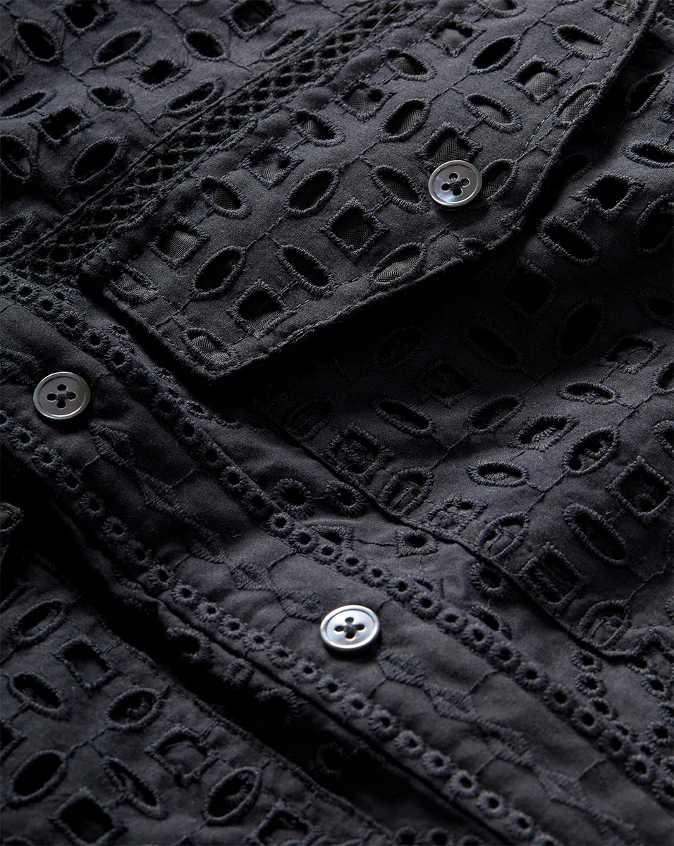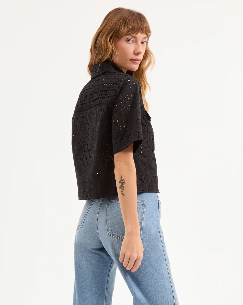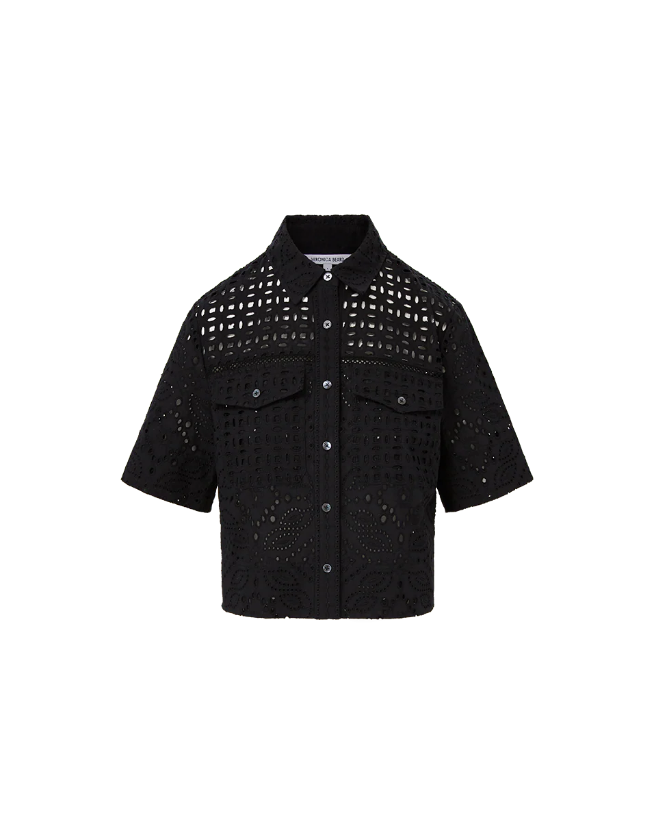 An elevated take on the summer shirt. Expertly tailored from lightweight cotton, the black Spruce top boasts a charming allover eyelet design. A warm-weather wardrobe hero, it's tailored for a cropped, boxy fit with wide half-sleeves for an effortless look and feel. Double front flap pockets add a utilitarian feel. Pair with jeans or the matching Fabian shorts for a dose of casual cool.
